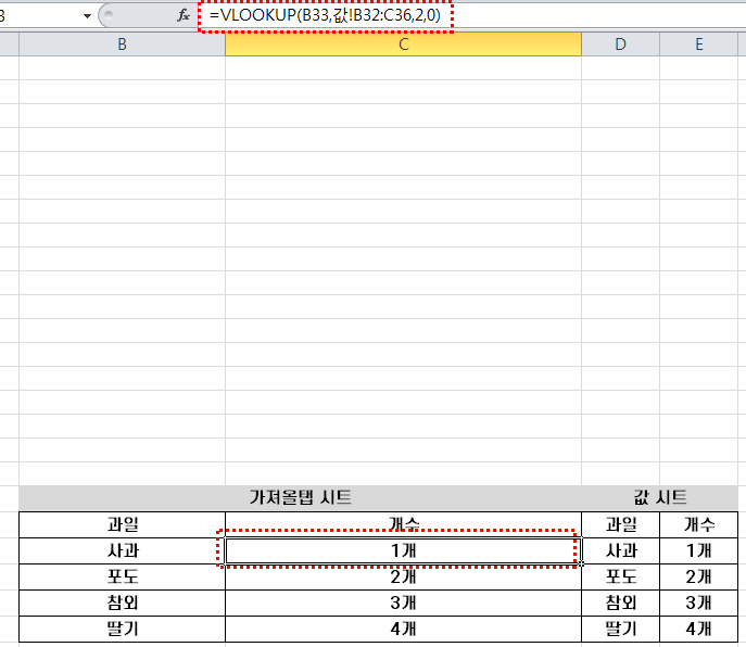 엑셀 수식을 하나씩 살펴보면 B33은 가져 올 탭 시트의 과일 이름입니다 사과의 개수를 알 수 있겠네요 그리고 두 번째로는 값 시트에 있는 과일명과 개수의 범위를 선택했습니다 그다음 중요한 것은 값 시트의 과일 목록이 첫 번째 드래그 목록에 와야 된다는 점입니다 그리고 개수는 과일목록 기준으로 두번째 열에 있으니 2를 기입했네요 마지막으로는 정확한 값을 찾기 위해 0을 넣어줬습니다 결과는 어떻게 나올까요 사과의 개수를 정확하게 불러오네요