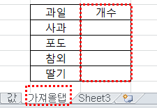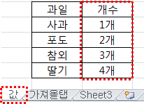 엑셀 값이라는 시트에는 사과 포도 참외 딸기의 개수가 적혀 있습니다 그리고 가져올탭 이라는 시트에는 개수가 공란이네요 이렇게 종류와 데이터가 적다면 수기로 입력해도 상관없겠지만 과일 종류가 50가지가 넘어간다면 시간이 오래 걸리겠죠 이럴 때 vlookup함수를 사용하면 굉장히 편리합니다